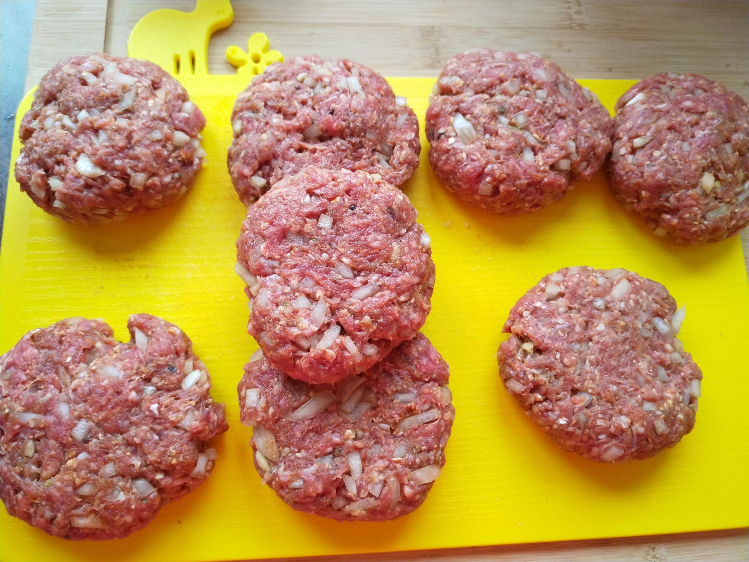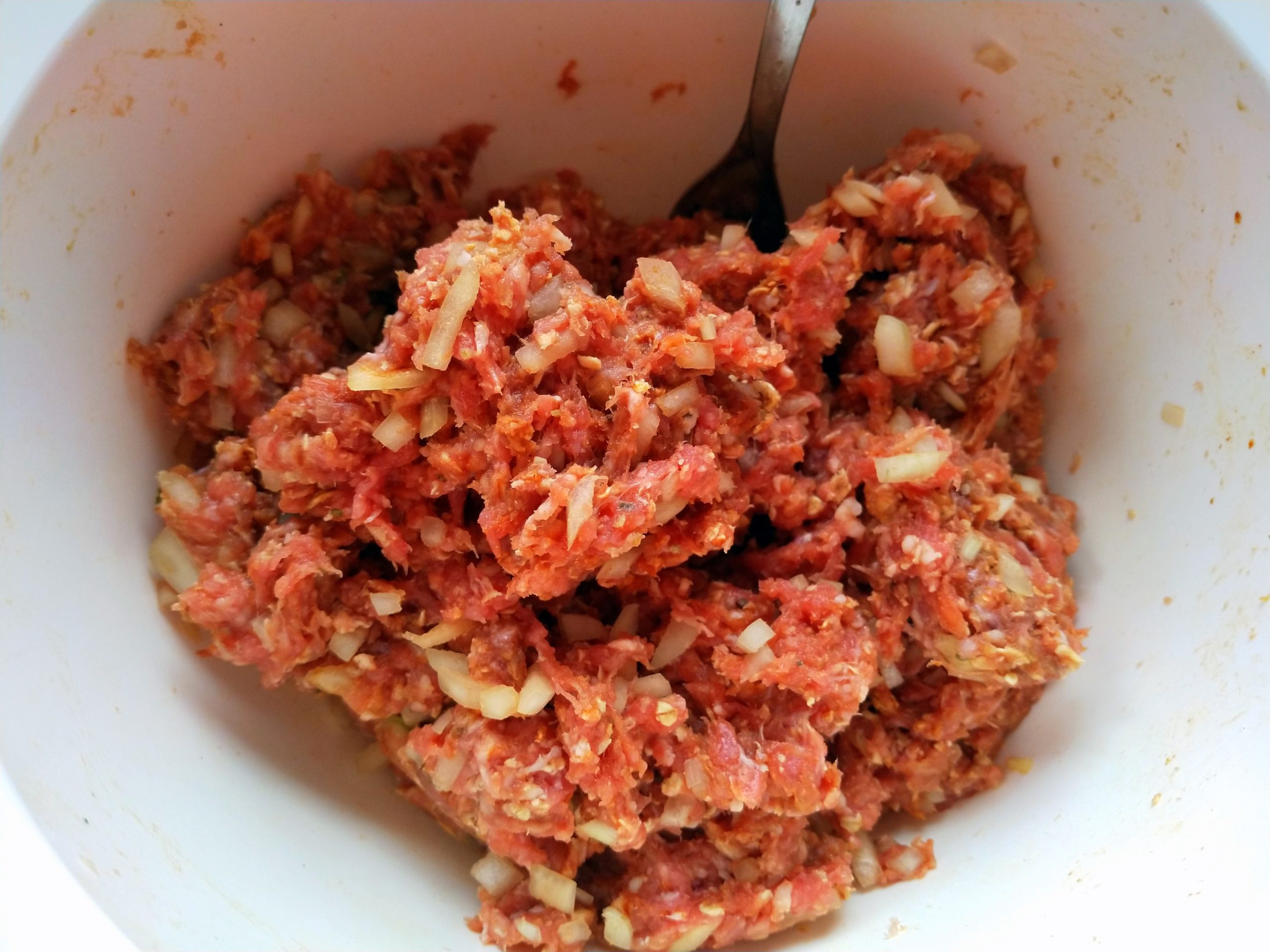 Das Hackfleisch kann auch in der Küchenmaschine mit den übrigen Zutaten vermengt werden, es wird dann allerdings feiner und dadurch nicht ganz so stückig.