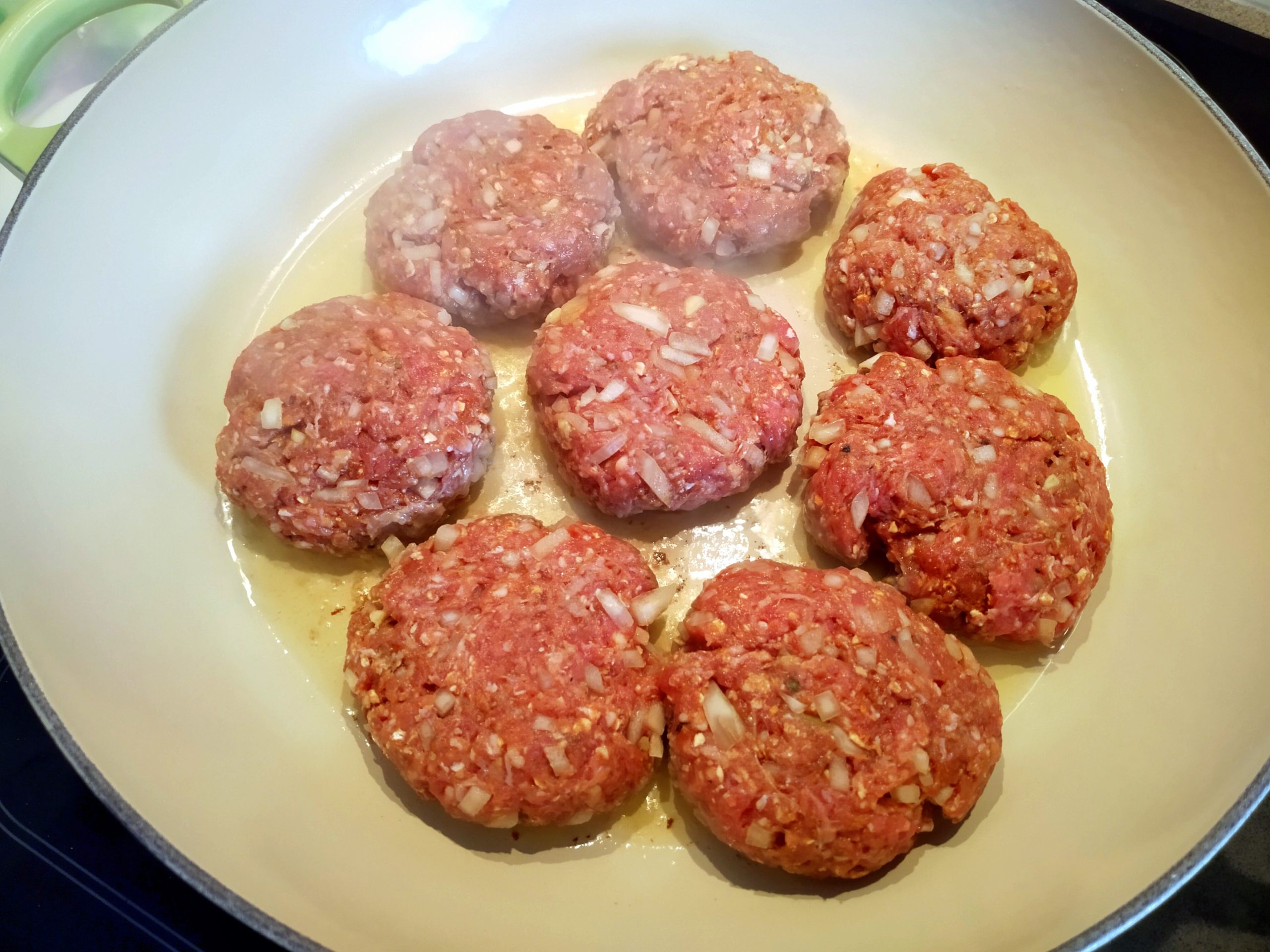 2. Aus der Masse Kugeln formen und etwas platt drücken. Anschließend in einer Pfanne etwas Fett erhitzen und die Fleischküchle scharf anbraten. Danach Hitze reduzieren und fertig garen.