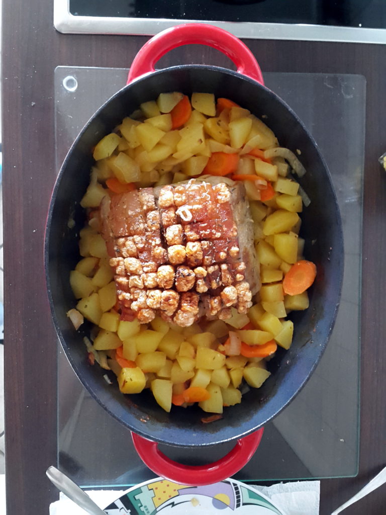 Anders als beim klassischen Gulasch wird das Fleisch hier roh in den Bräter mit dem Gemüse gegeben, alles durchgerührt und dann nur noch schmoren gelassen. Spart Zeit und Aufwand, lässt sich also auch super vorbereiten.