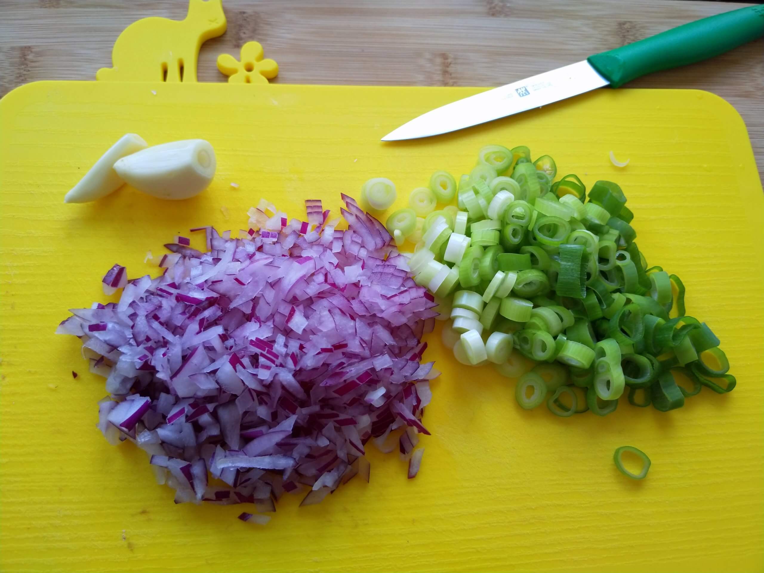 Frühlingszwiebeln und Petersilie klein schneiden, zur Masse geben und erneut vermischen. Mit Pfeffer und Zitronensaft abschmecken.