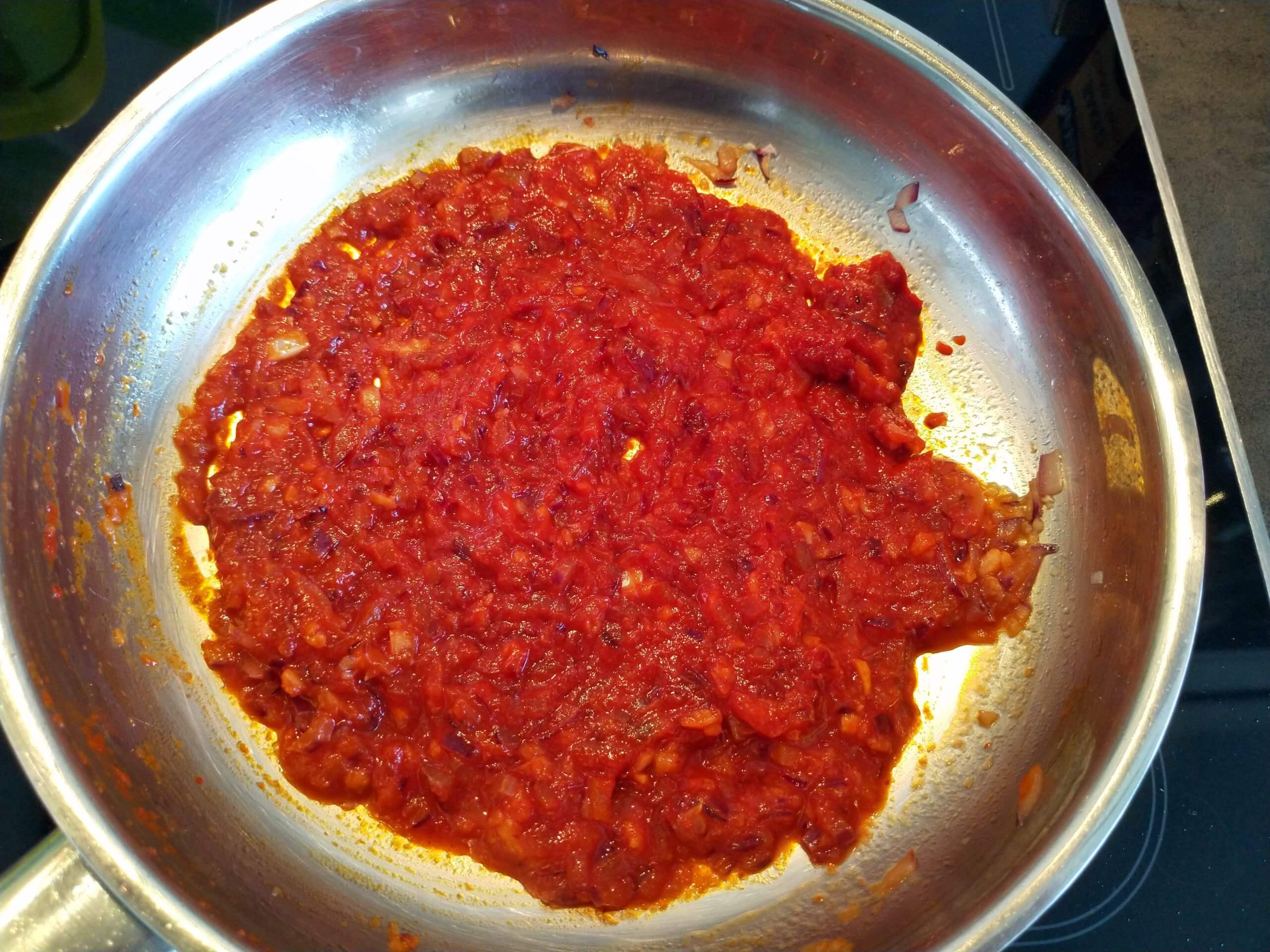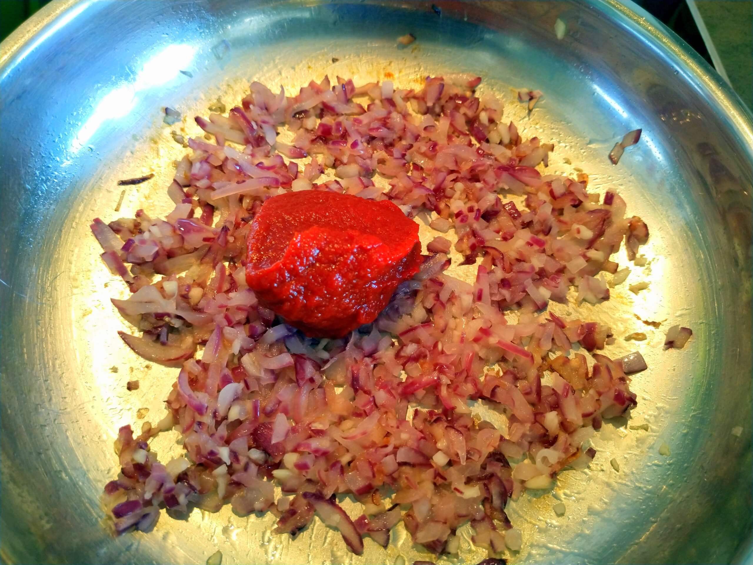 Knoblauch und Zwiebeln fein hacken und in etwas Öl andünsten. Tomatenmark, Paprikamark und Salz dazugeben und mit ca. 30 ml Wasser kurz aufkochen und dann zur Linsen-Bulgur-Masse dazugeben. Alles gut durchmischen und abgedeckt abkühlen lassen.