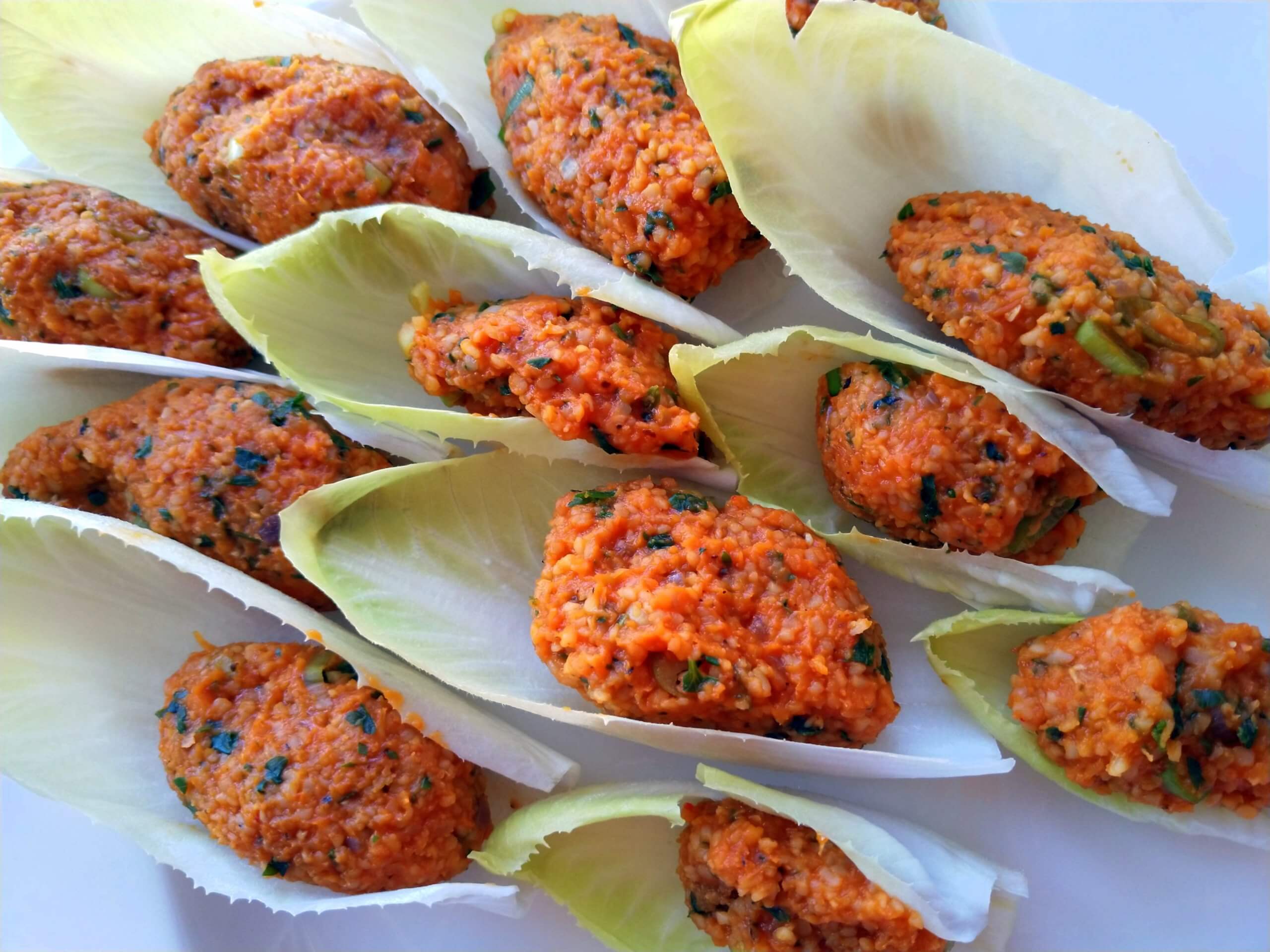Mercimek Köfte ist perfekt als Fingerfood oder auch für ein Büffet geeignet. Die Chicoree-Blätter dienen als Besteck-Ersatz. Alternativ kann auch grüner Salat als Unterlage genommen werden.