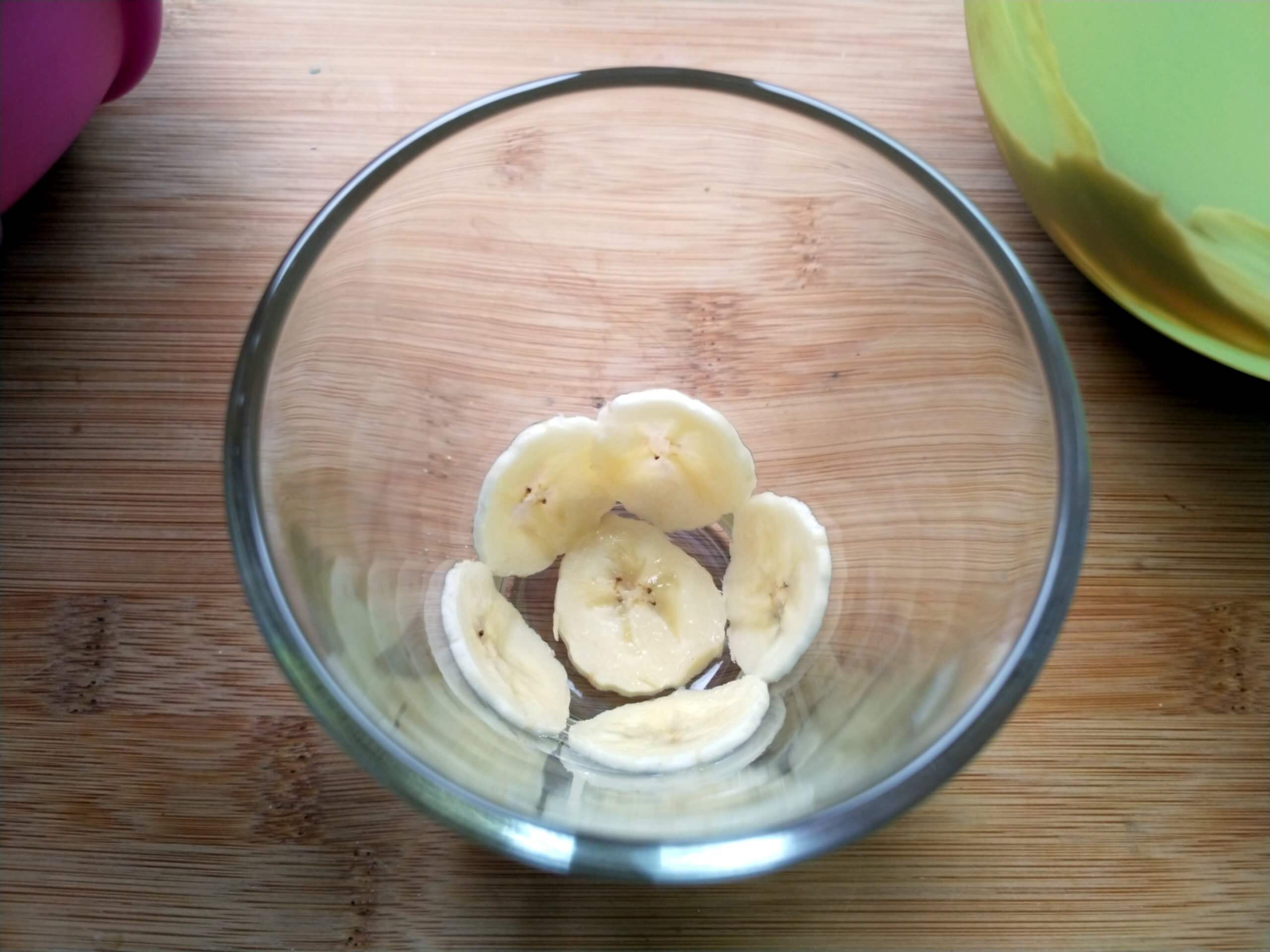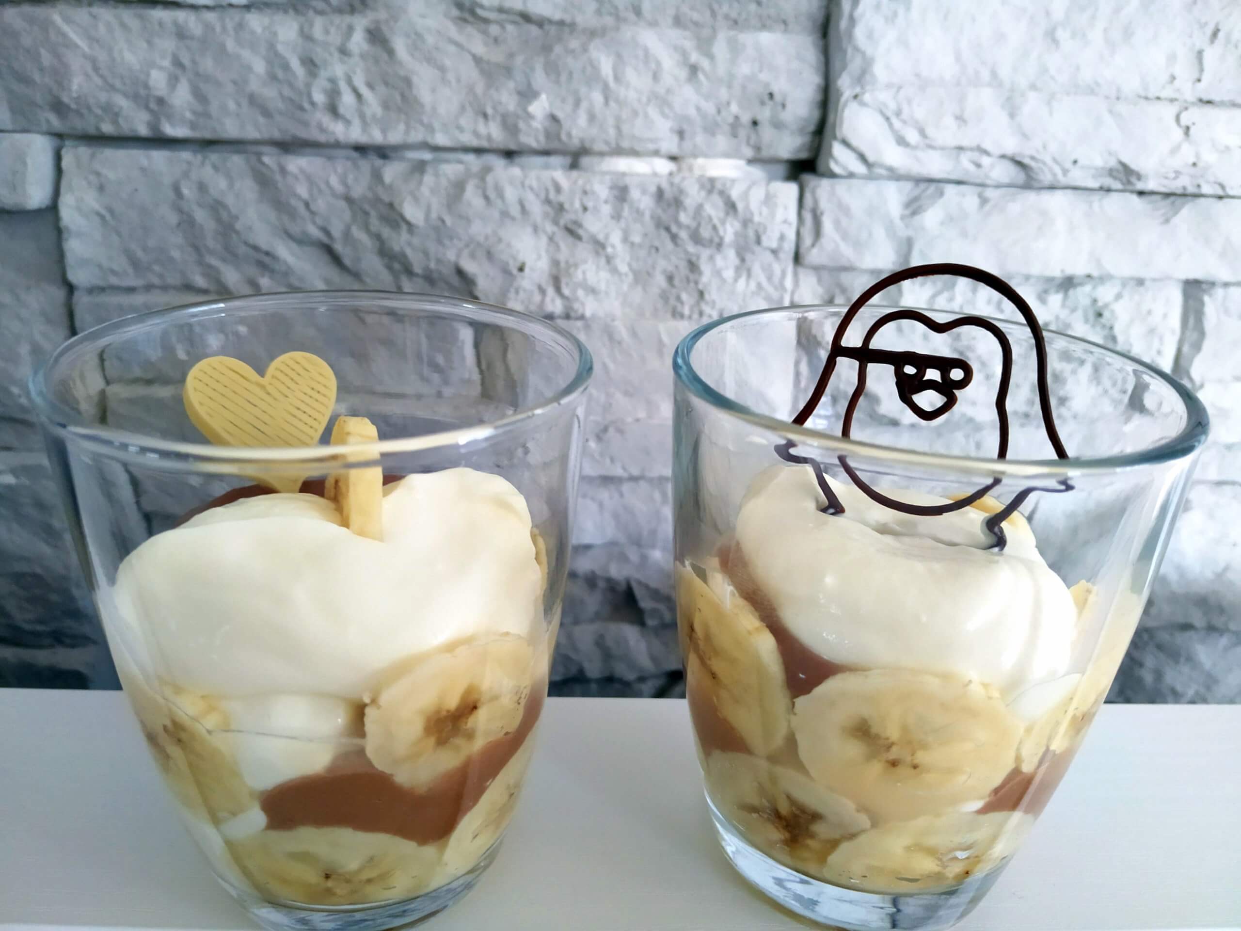 Die Banane in ganz dünne Scheiben schneiden und ein Glas damit auslegen. Abwechselnd die Cremes hineingeben, dabei kann man auch nochmal eine Reihe Bananenscheiben im Glas legen.