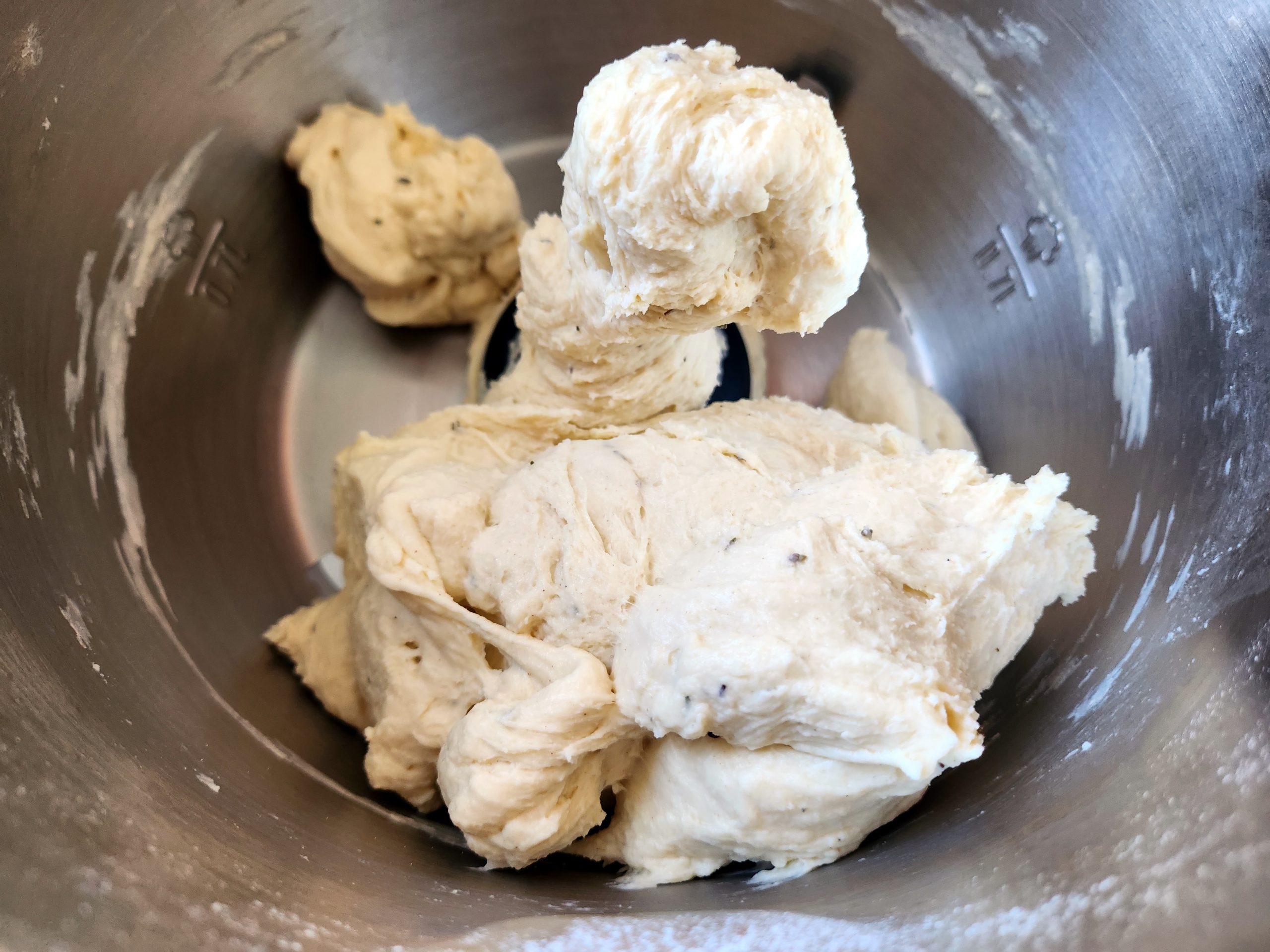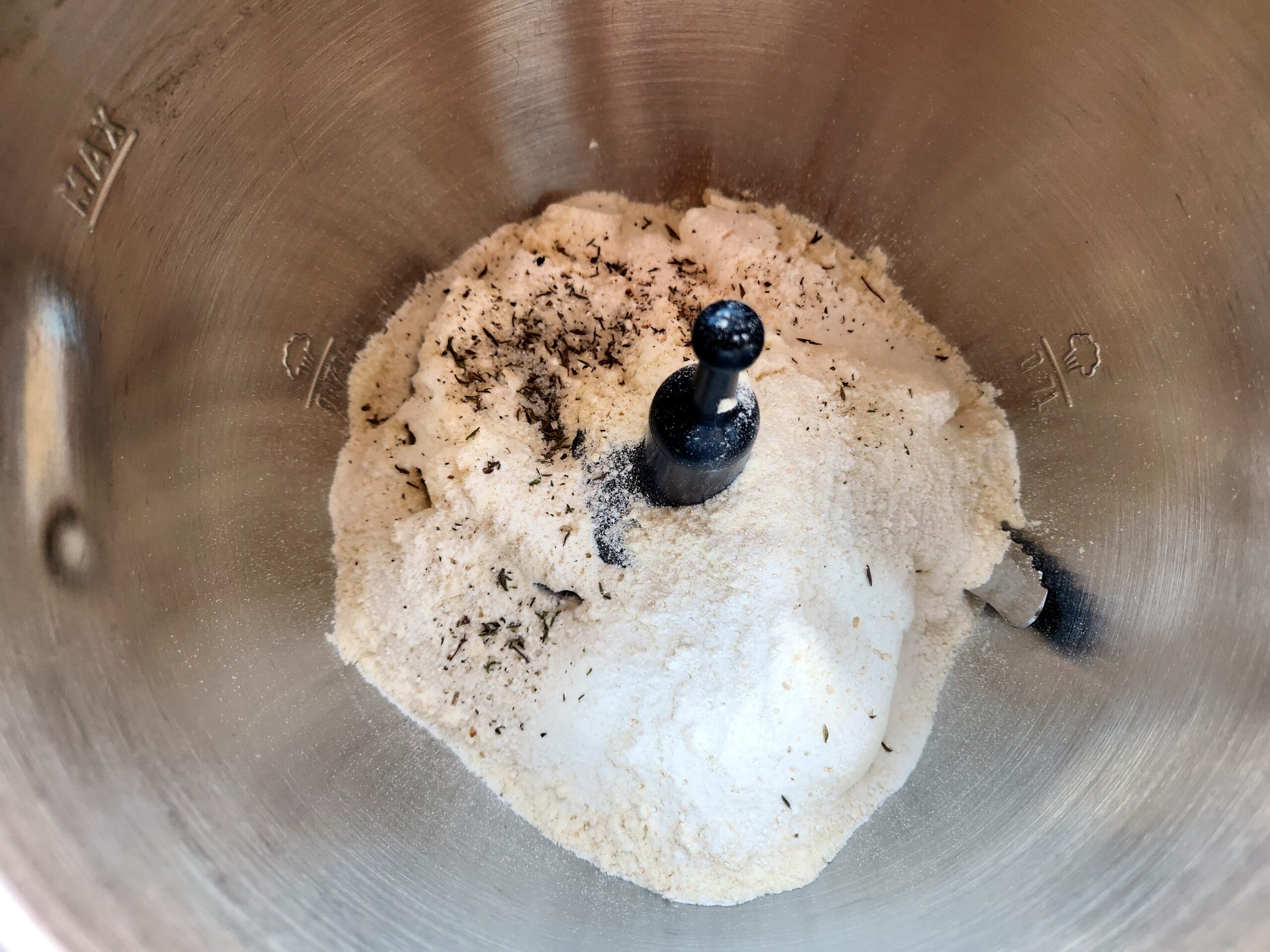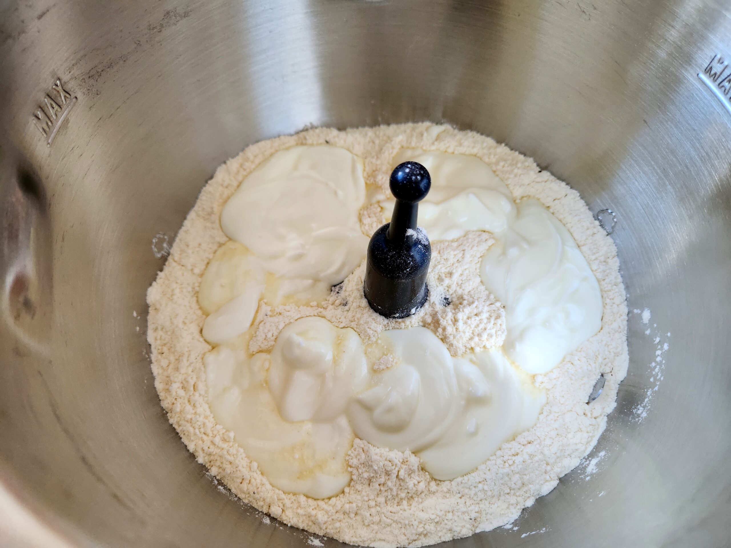 Bei Verwendung der Prep&Cook das Knet-/Mahlmesser einsetzen. Die trockenen Zutaten in der Schüssel 30s auf Stufe 6 miteinander vermischen. Anschließend den Joghurt zugeben und auf Stufe 5 zu einem geschmeidigen Teig ca. 3-5min kneten. Der Teig sollte sich zum Schluss vom Schüsselrand lösen.