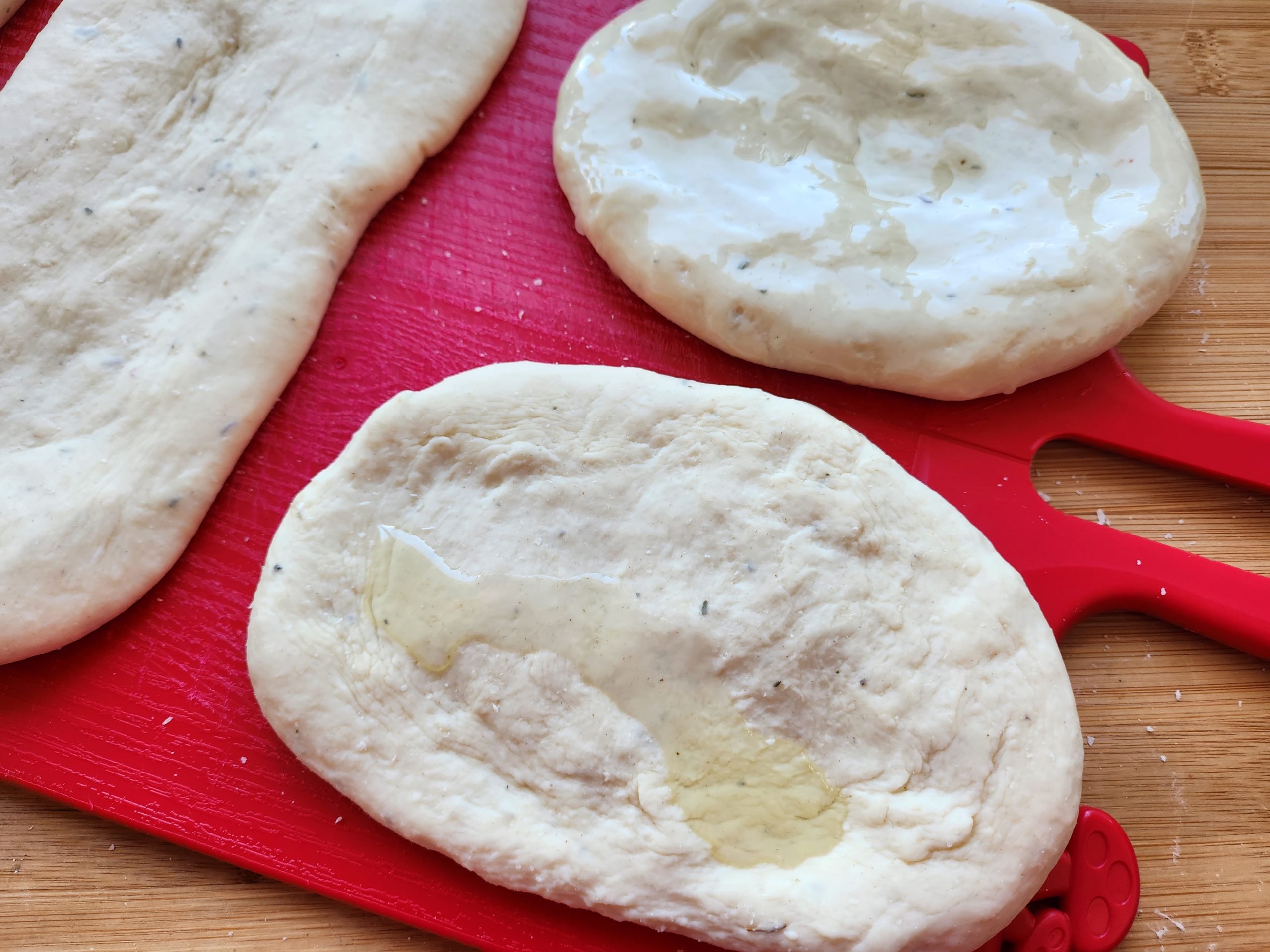 Den Teig auf einer bemehlten Arbeitsplatte kurz kneten und in 6-8 Stücke teilen. Kleine, flache Brote oder Fladen formen und von einer Seite mit Olivenöl dünn bestreichen.