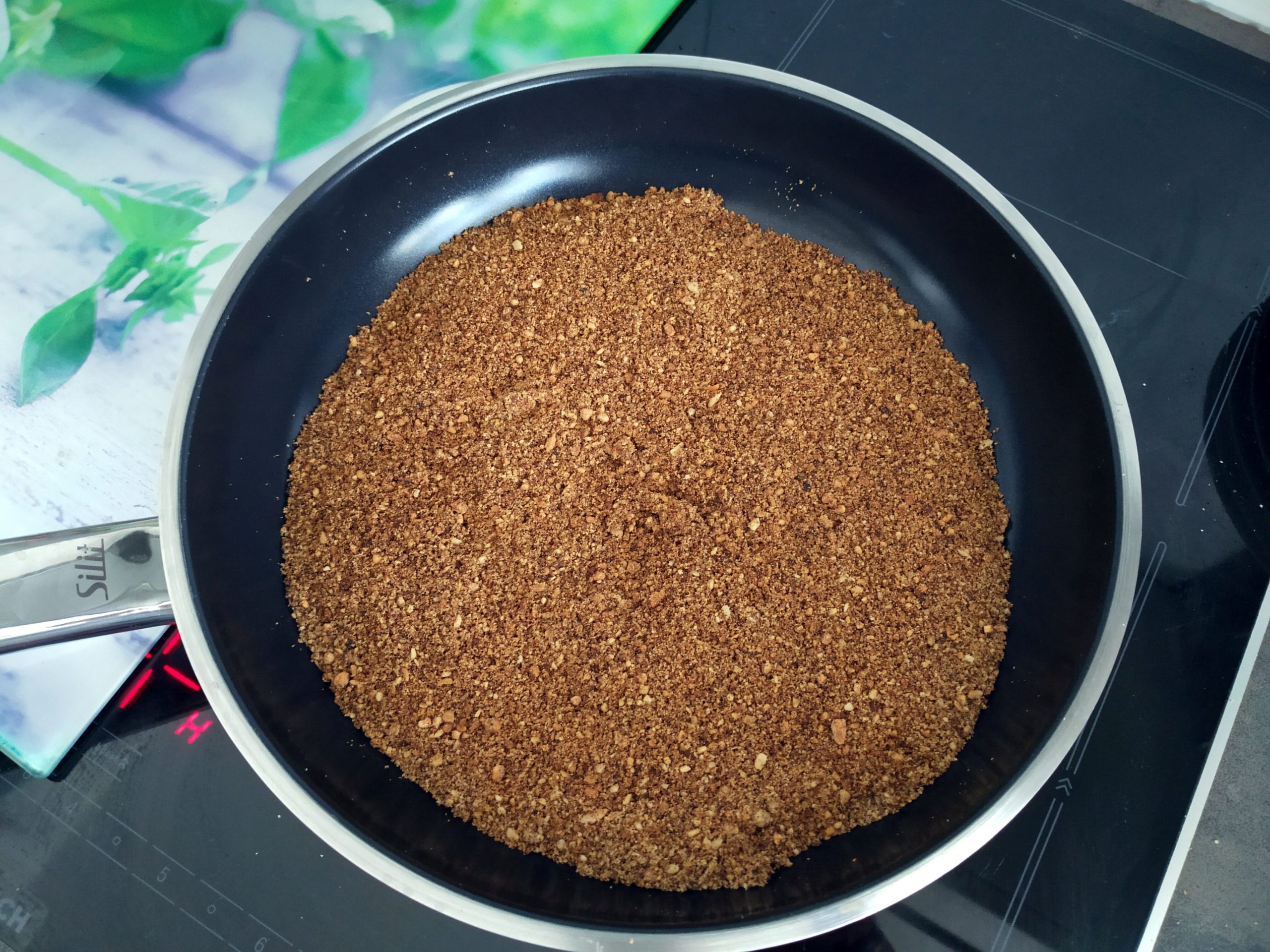 Haselnüsse in einer beschichteten Pfanne ohne Fett anrösten. Dabei aufpassen, dass man nicht zu heiß stellt, sonst verbrennen die Haselnüsse.