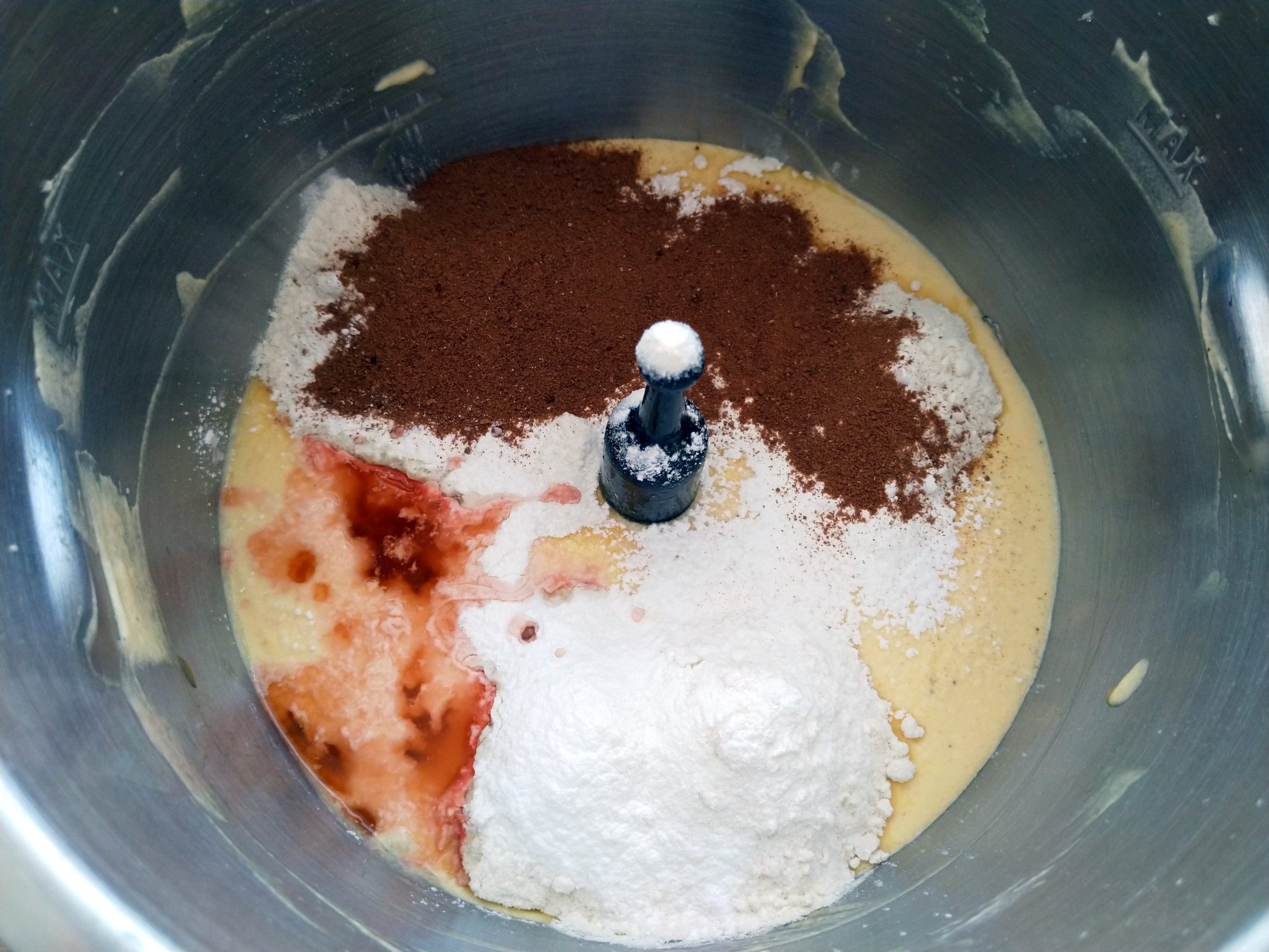 Mehl mit Backpulver und Kakao mischen und Rum zum Eier-Butter-Gemisch dazugeben. Kurz mischen, dann die restlichen Zutaten zugeben und zu einem glatten Teig verarbeiten.