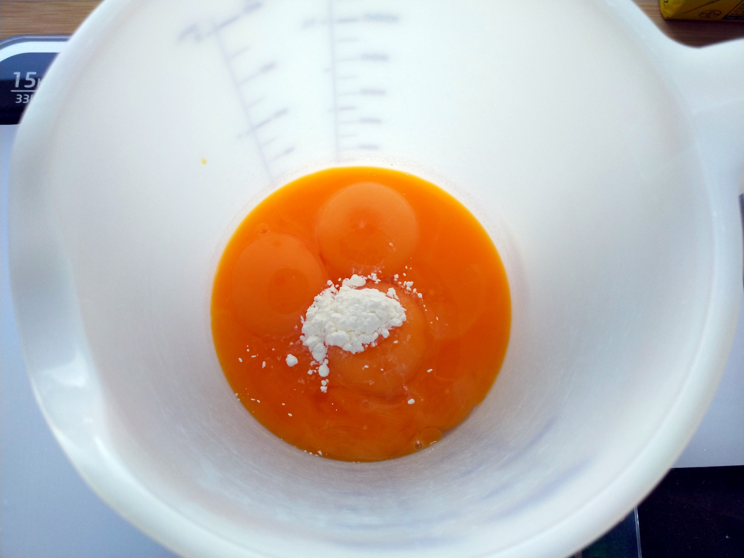 1. Eier trennen. Sahne, Vanillezucker und Zucker in aufkochen. In einer separaten Schüssel Eigelbe mit der Stärke vermischen. Ca. ein Drittel der heißen Sahne langsam zur Eigelbmasse dazugeben, dann die gesamte Eigelbmasse in die restlichen Sahne einrühren.