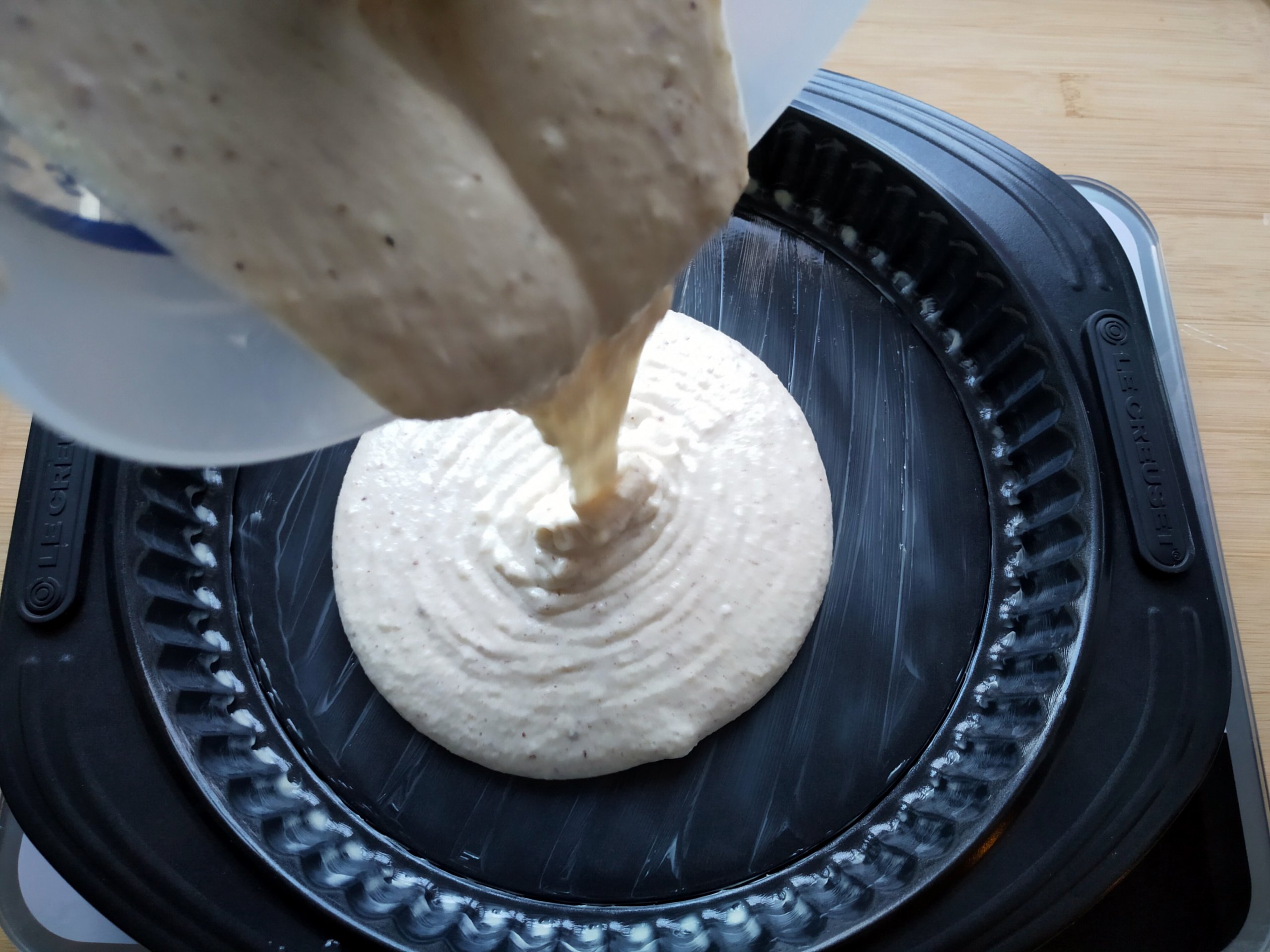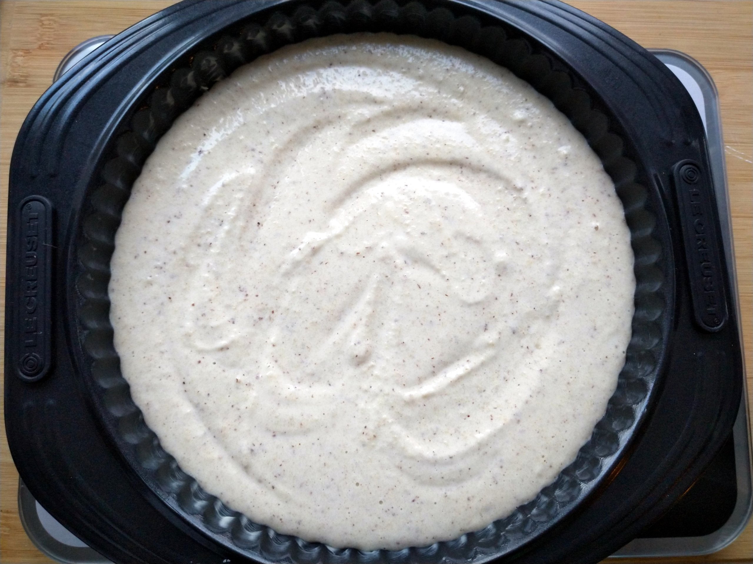 1. Während die Creme abkühlt die Eiweiße steif schlagen. Den Puderzucker dazugeben und weiter steifschlagen. Zum Schluss die Mandeln unterheben und in eine gefettete Tarteform gießen.