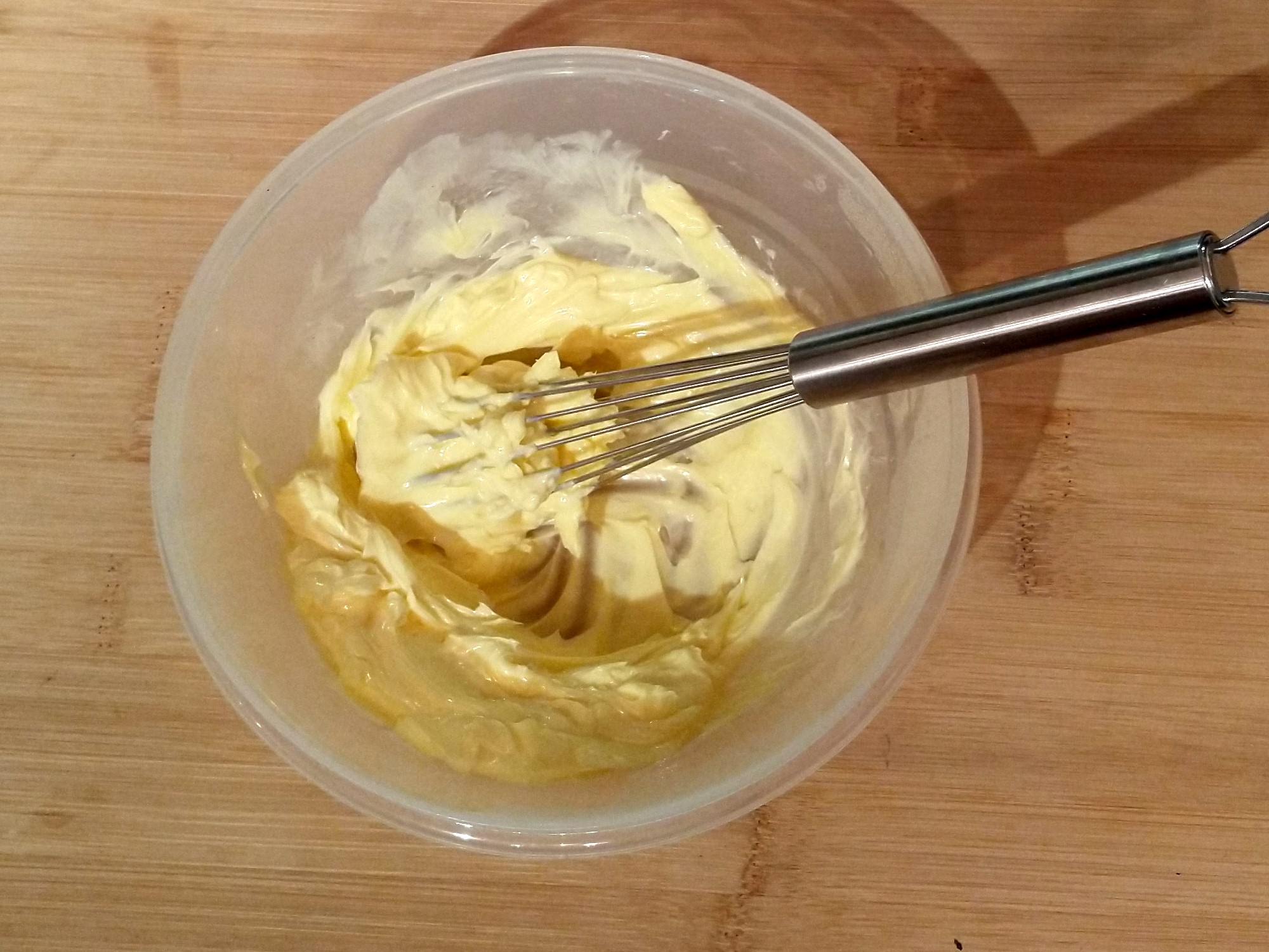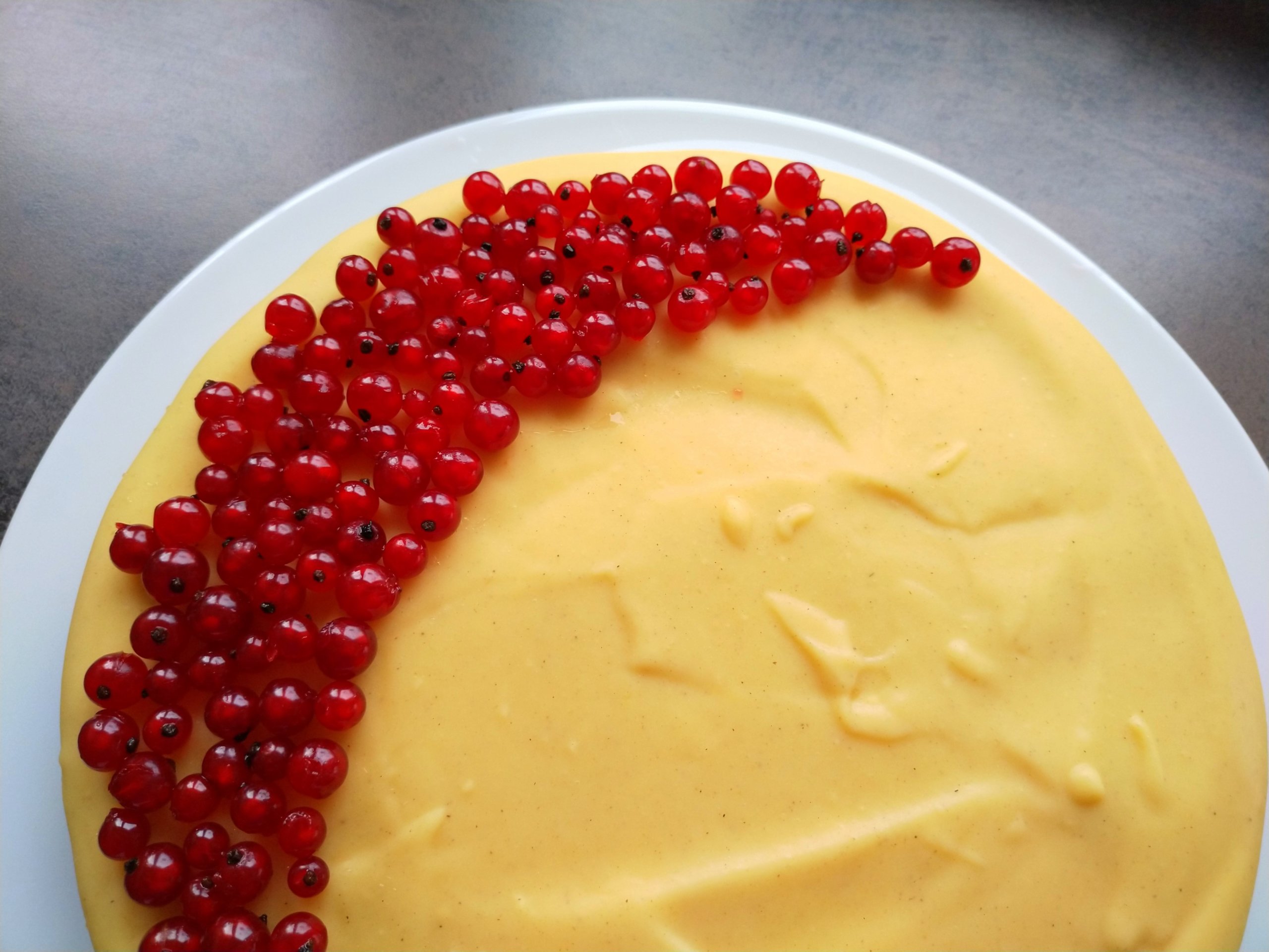 1. Die Creme auf den ausgekühlten Boden geben und glatt streichen. Im Kühlschrank ca. 1 h fest werden lassen. Die helle gelbe Farbe entsteht beim Abkühlen im Kühlschrank ganz von allein.