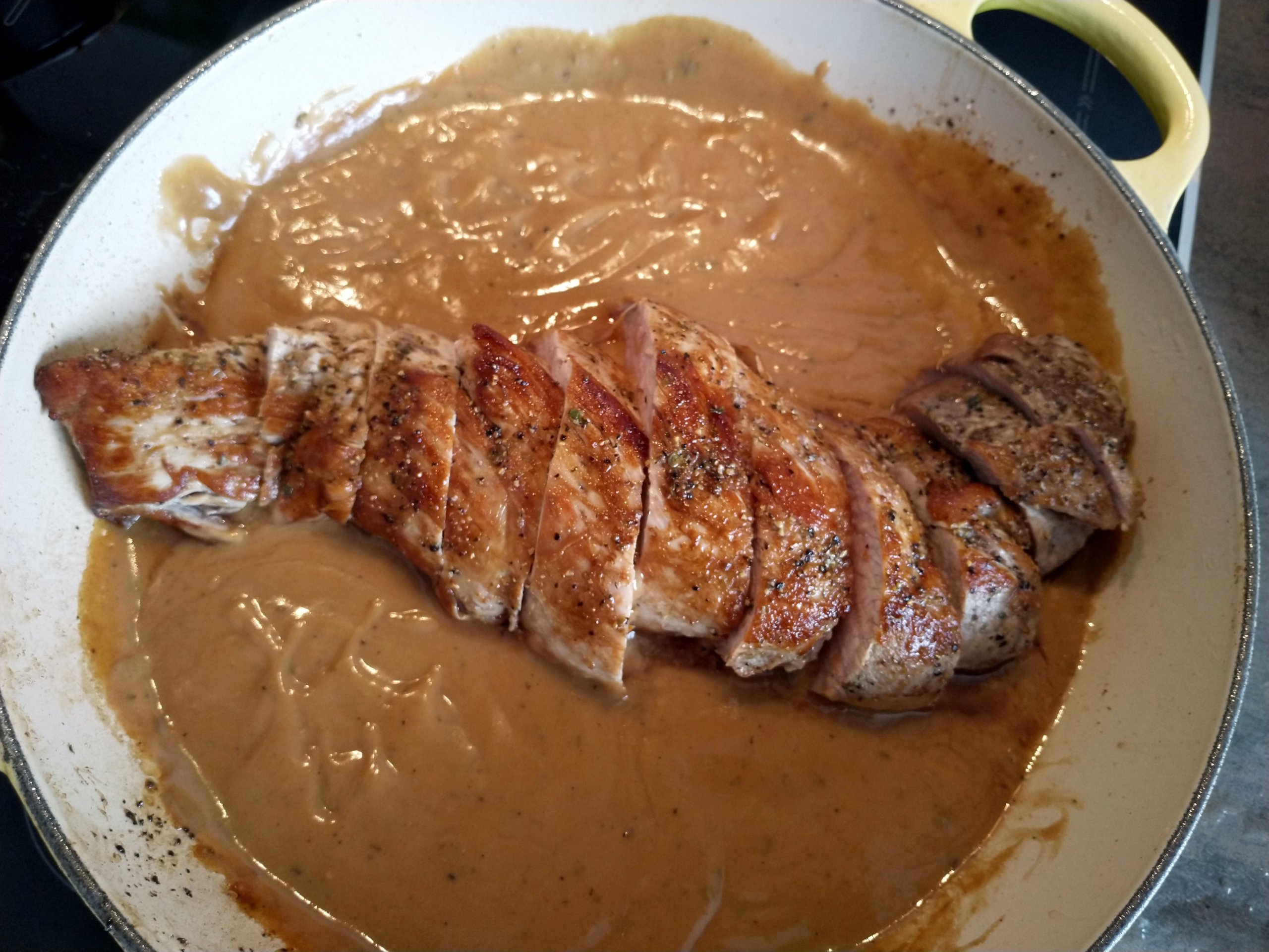 Nach ca. 25 min Garzeit das Fleisch herausnehmen, fast den ganzen Bratenfond in die Pfanne gießen und erhitzen. Im restlichen Bratenfond die Stärke einrühren und wenn der Fond kocht, unter Rühren hineingießen. Einen guten Schuss Sahne dazu, abschmecken und fertig ist die Sauce. Das Fleisch in Medaillons schneiden und mitsamt dem ausgetretenen Fleischsaft in die Sauce legen.
