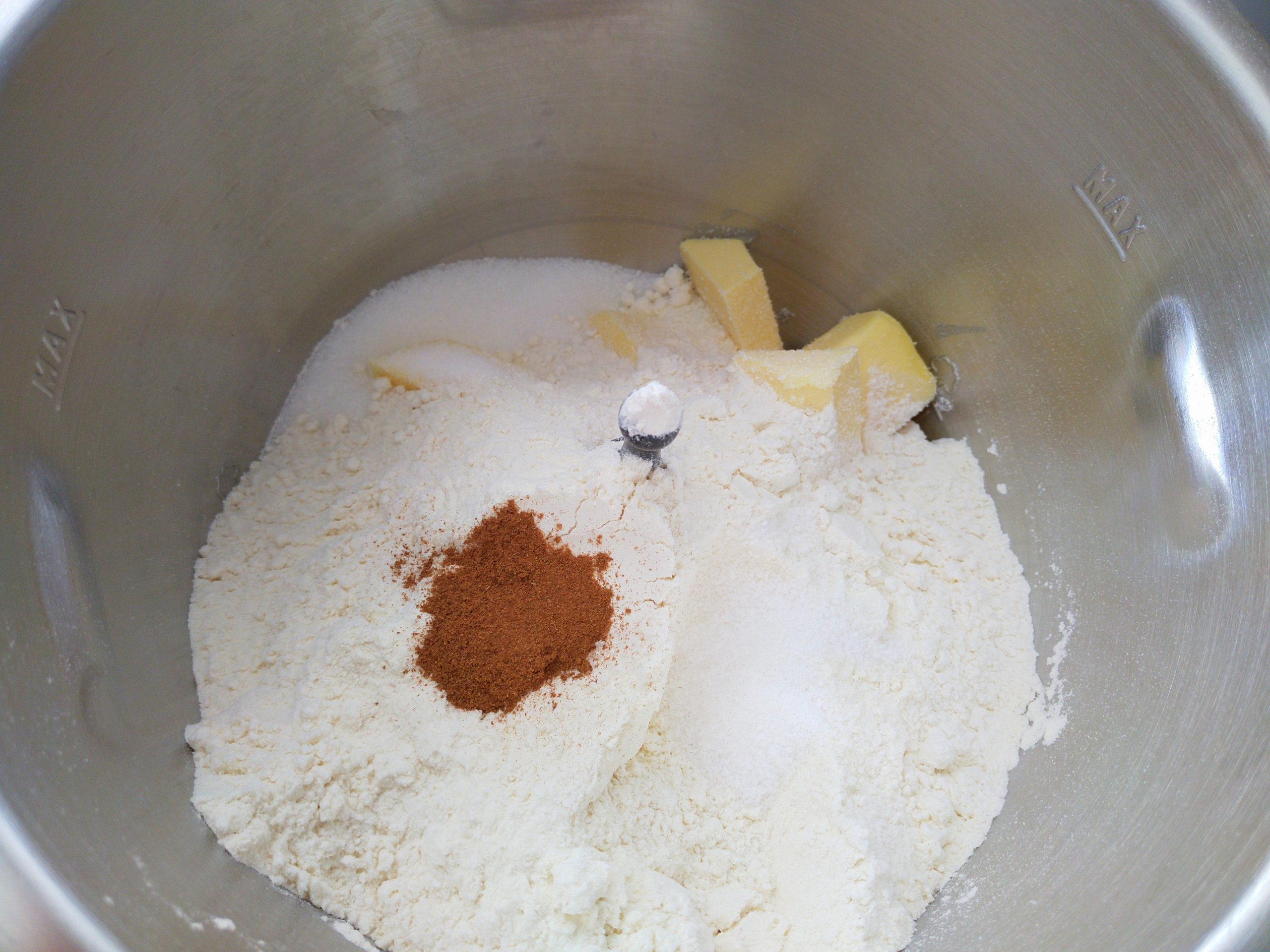 Kalte (!) Butter in kleine Stücke schneiden und mit den anderen Zutaten per Hand vermengen und zu groben Bröseln verreiben, kalt stellen.