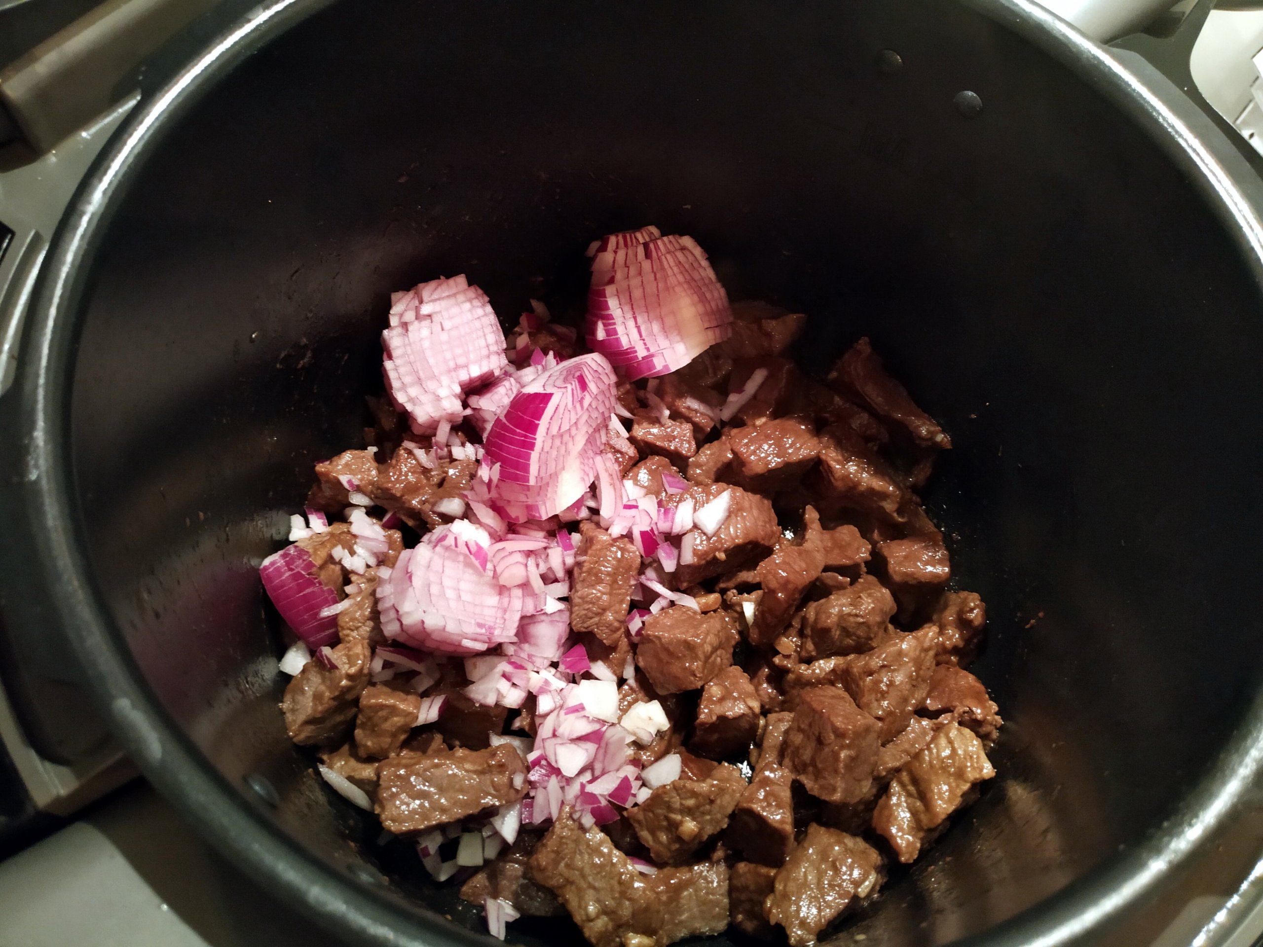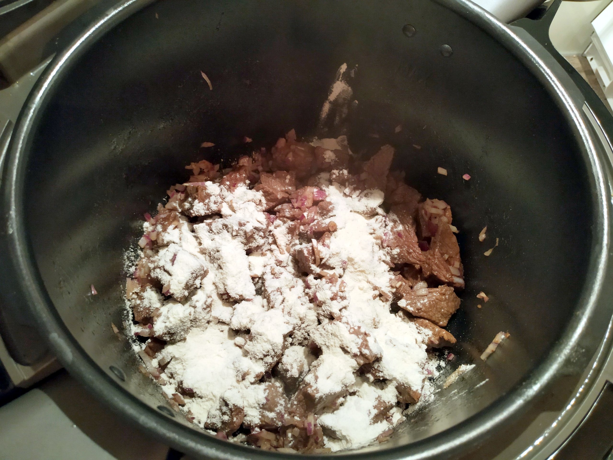 Bei der Cook4Me die Zwiebeln und Knoblauch zum Fleisch dazugeben, kurz andünsten und zum Schluss das Mehl darüberstäuben und vermischen.