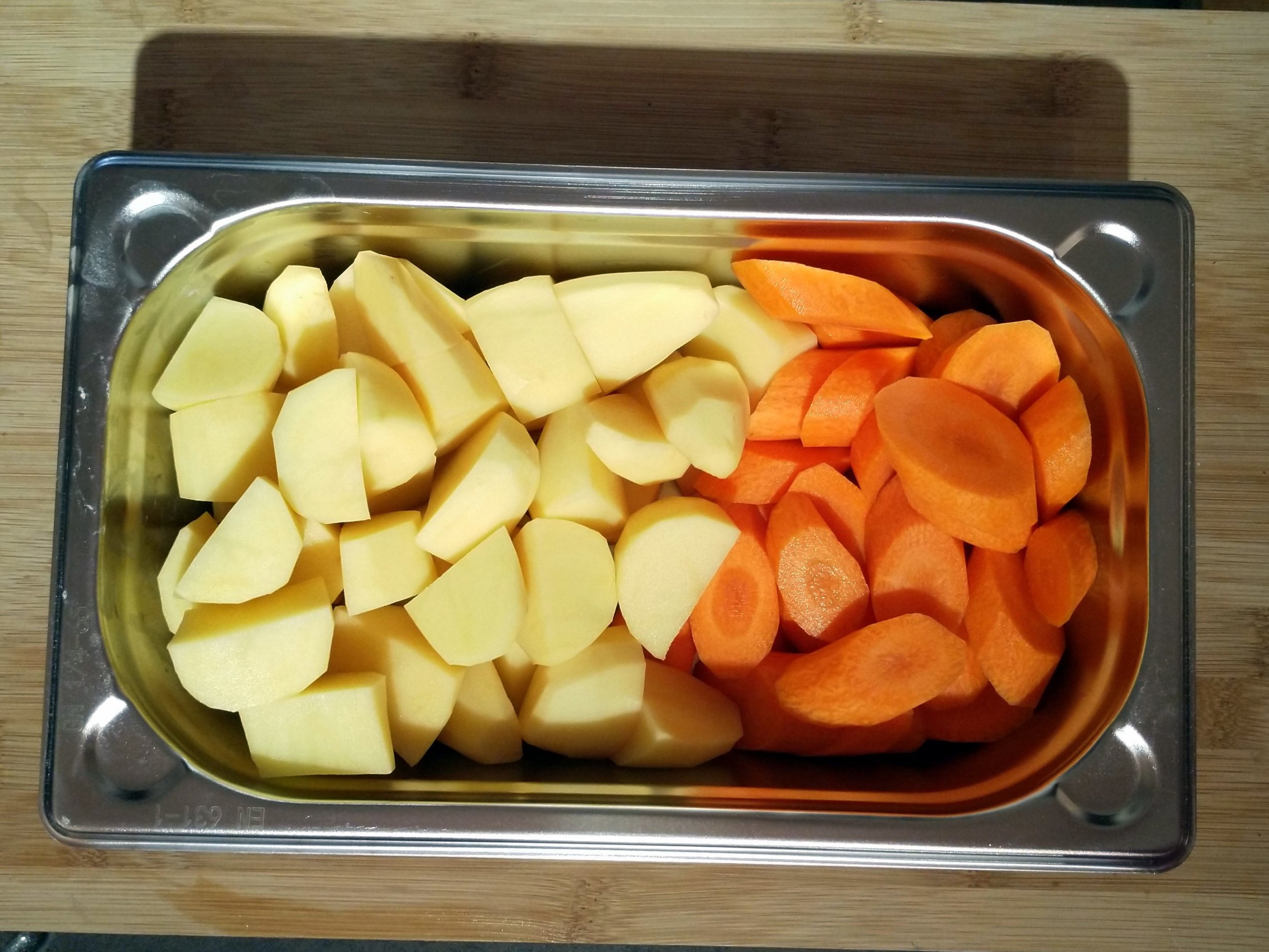 Kartoffeln und Karotten schälen und in grobe Stücke schneiden. Zwiebel klein würfeln, den Knoblauch fein hacken.