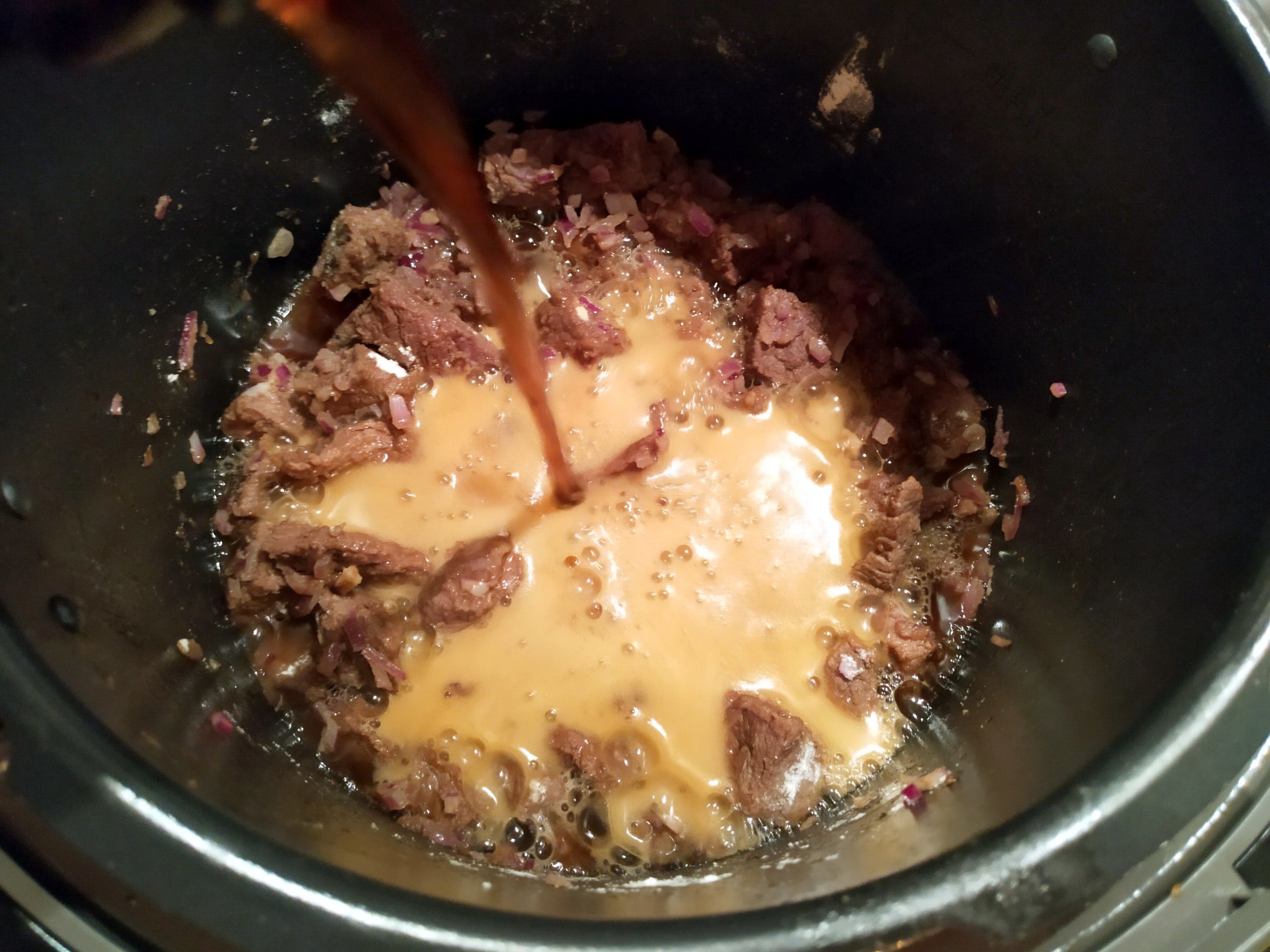 Bier und Rinderfond einrühren. Zum Schluss das Gemüse dazugeben. Gewürze und Tomatenmark mit rein und alles verrühren.