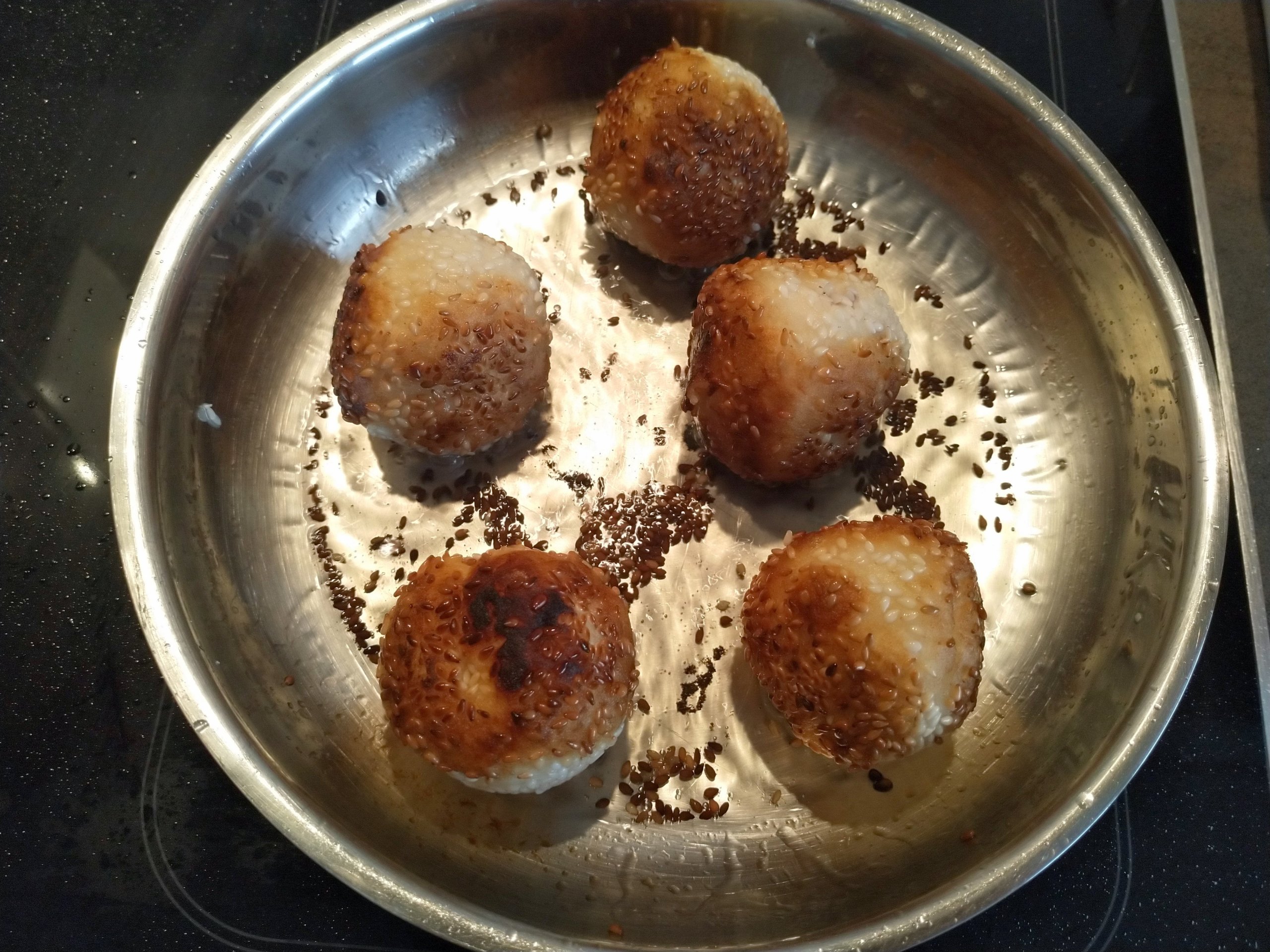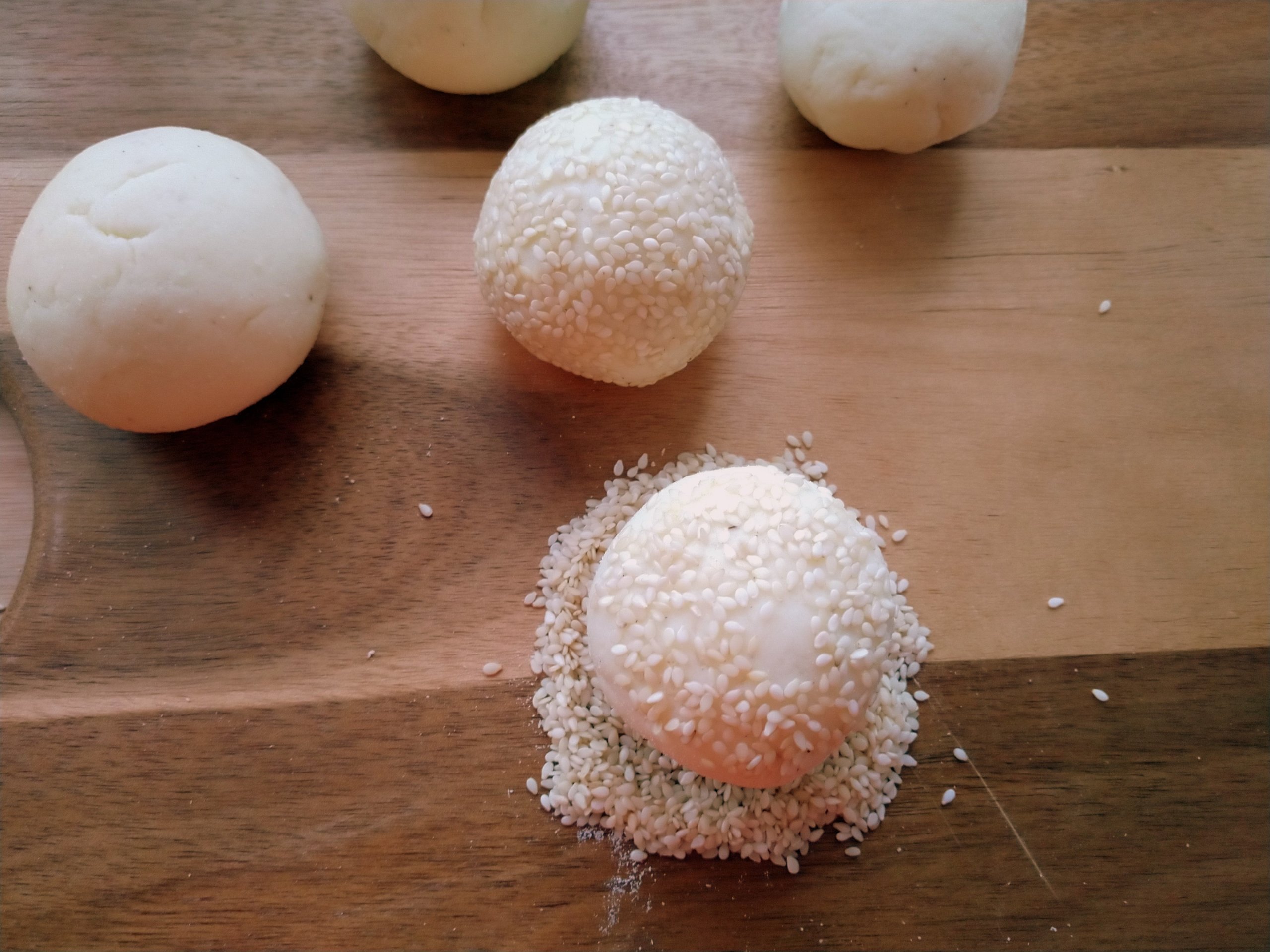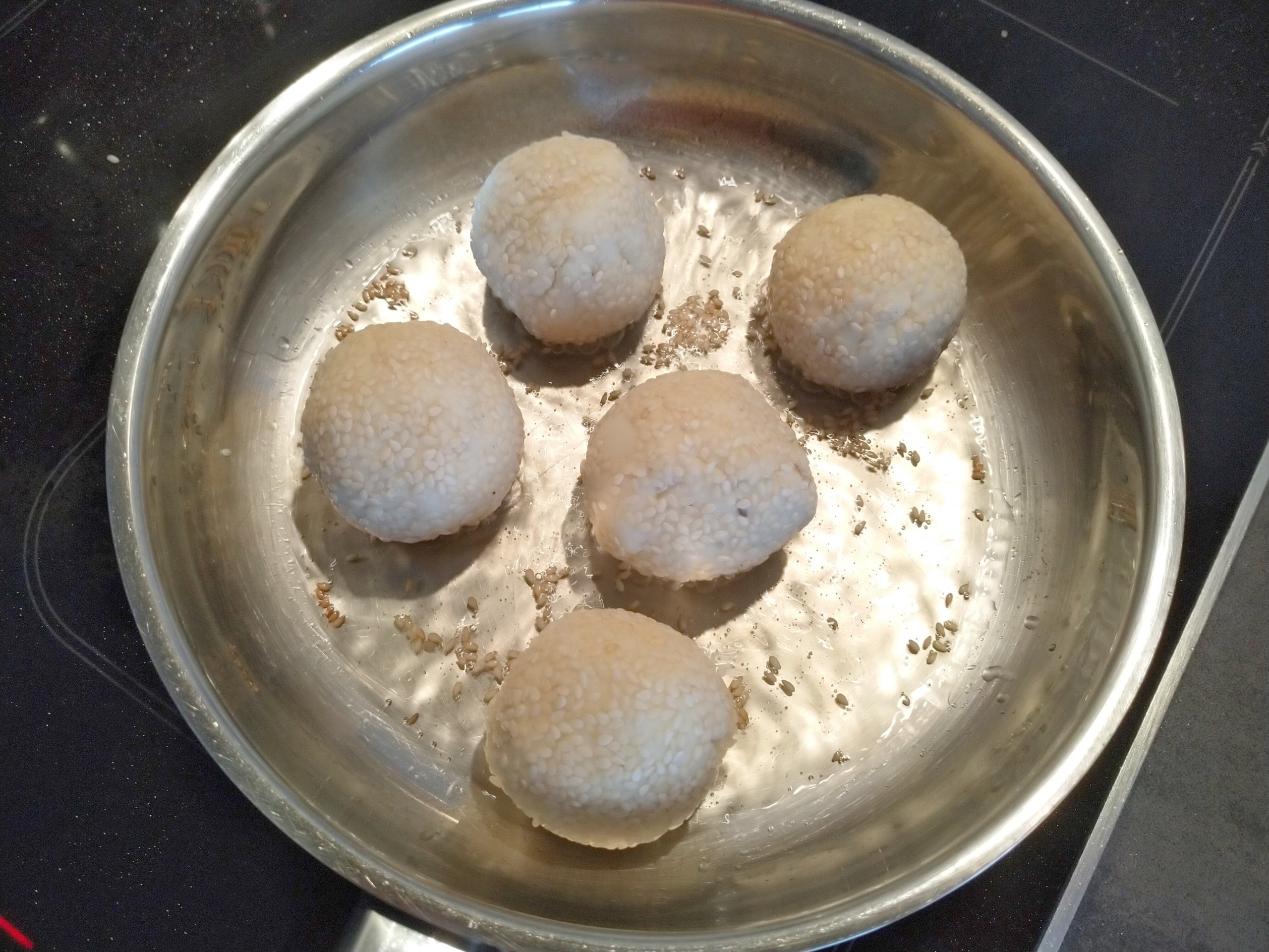 Einige EL Sesamsamen auf die Arbeitsfläche geben und die Kugeln darin rollen, gut andrücken. Anschließend in einer hohen Pfanne mit ordentlich Öl darin ausbacken. Wichtig ist, dass das Öl nicht zu heiß ist (ca. 160°C), sonst verbrennt der Sesam.
